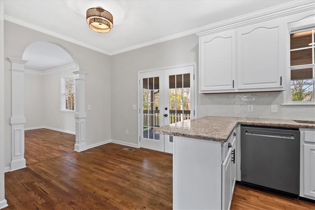 - KitchenBreakfast Bar, Cabinets White, Eat-in Kitchen, Solid Surface Counters, Stone Counters