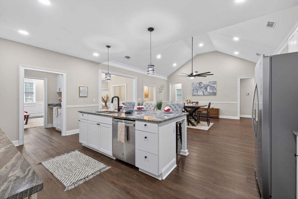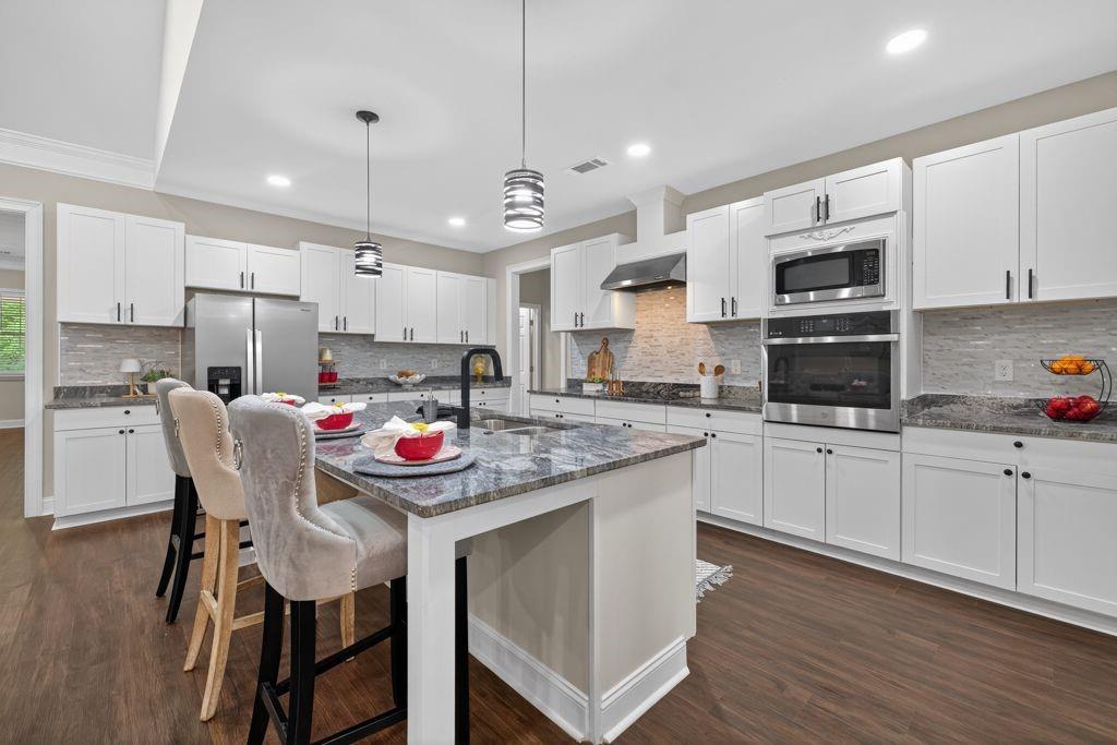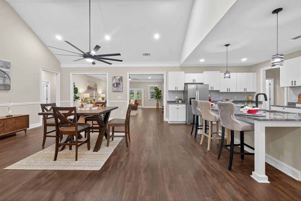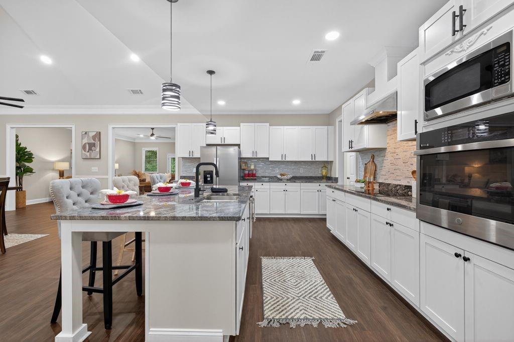 - KitchenBreakfast Bar, Breakfast Room, Cabinets White, Eat-in Kitchen, Kitchen Island, Pantry, Solid Surface Counters, View to Family Room