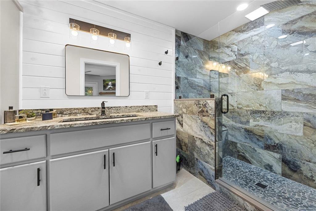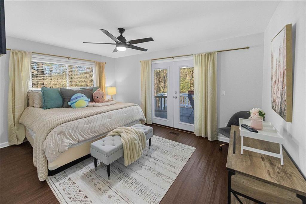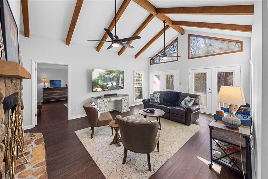 Private North Georgia retreat situated on 2+ acres in Ellijay! This 3-bedroom, 2.5-bath ranch features an updated kitchen with white cabinetry, solid surface countertops, and stainless steel appliances, along with renovated bathrooms and durable flooring throughout the main living areas. Beamed ceilings add character to the main living space, anchored by a double-sided fireplace positioned between the living and dining areas. Functional layout all on one level with well-sized bedrooms, french doors in every room, and a spacious laundry room with additional storage. The primary master suite has a luxurious feel with heated floors in the bathroom. The flex space offers potential for an office, storage, and more. Home is equipped with a full-house generator for added reliability, and TVs in each room will remain with the property. Positioned on a wooded lot with a covered front porch and back deck, and koi pond with mature koi, providing privacy while still being conveniently located to town, shopping, and dining- make this your home today!