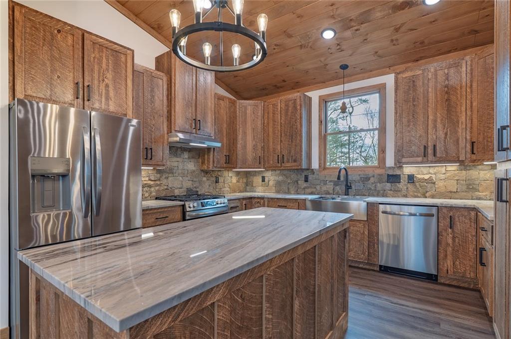 A rare opportunity to own a Luxury Mountain Retreat where modern comfort meets timeless rustic charm. Experience Mountain Modern living in this stunning New Construction home designed to capture breathtaking year-round Mountain & River Views through the expansive wall of glass. Perfectly blending rustic elegance with modern design. This thoughtfully crafted home features upgrades throughout including custom cabinetry, rustic accent walls, duel fuel furnace, zoned heating and air, pella doors and windows, hot water recirculating system and more. Thoughtfully designed floor plan; The open-concept main level offers a spacious living, dining, and kitchen area centered around a gorgeous real Tennessee Fieldstone fireplace, creating the perfect gathering space. The main level also includes a large private master suite and convenient half bath for guests. The finished terrace level provides additional living space with a second family room, a built-in bar, two bedrooms, and a full bathroom—ideal for guests or entertaining. The Outdoor Living space is truly exceptional with two full-length covered porches, each featuring its own real Tennessee Fieldstone fireplace, giving you three total fireplaces throughout the home. Relax while taking in the Views and enjoying the peaceful sounds of Mountaintown Creek from the back porch. Situated on a 1.64-acre lot in a beautiful, nature-filled setting in Coosawattee, the property offers privacy and convenience with a circular driveway and plenty of space to enjoy the abundant wildlife and surrounding mountains. Coosawattee ameneties include gated access, indoor/outdoor swimming pools, tennis courts, river access, stocked fishing pond, and more.
