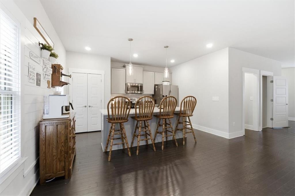 - KitchenBreakfast Bar, Cabinets White, Eat-in Kitchen, Kitchen Island, Pantry, Solid Surface Counters, View to Family Room