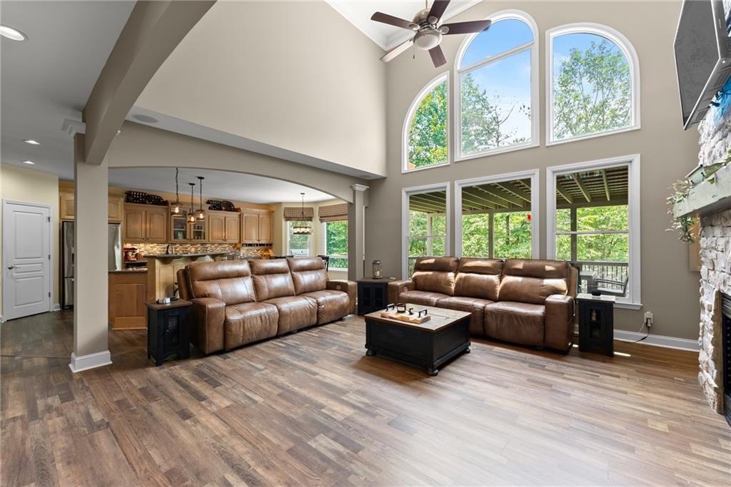 Nestled in the tranquil Sky Country community just minutes from downtown Dahlonega, this stunning traditional home sits on a quiet cul-de-sac, offering the ideal blend of privacy, craftsmanship, and upscale living. The current owners have spared no expense in a sweeping, top-to-bottom transformation that makes this already exceptional property feel brand new. Step inside to a thoughtfully designed layout perfect for both entertaining and everyday living. The gourmet kitchen is a true showstopper, featuring stainless steel appliances, a gas range, spacious island with double sink, breakfast nook, walk-in pantry, built-in desk, and abundant cabinet space. Elevated touches include a touch-activated faucet, an instant hot water tap, and a dedicated coffee bar. A brand-new microwave and washer & dryer are also included and remain with the home. The grand living room commands attention with soaring 18-foot ceilings and a jaw-dropping, newly custom-built floor-to-ceiling stone fireplace. This dramatic, one-of-a-kind centerpiece anchors the entire main level and simply must be seen in person. Newly installed LVP flooring flows seamlessly throughout both the main and lower levels, tying the entire home together in a clean, contemporary finish. Updated light fixtures and freshly repainted interiors throughout give every room a crisp, move-in-ready feel. A formal dining room with a lighted tray ceiling sets the stage for memorable gatherings. Retreat to the primary suite featuring a private sunroom, perfect for morning coffee or evening relaxation. Dual walk-in closets with custom built-ins provide ample storage, while the spa-inspired bathroom offers dual vanities, a jetted tub, multi-head shower, private water closet, and heated tile floors. Upstairs, two Jack-and-Jill layouts offer four additional bedrooms and two fully refreshed and remodeled full baths, both thoughtfully updated for style and function. A large bonus room over the garage and an additional main-level flex space provide endless options for a home office, gym, or playroom. Outdoor living shines with a welcoming front porch, a heated and cooled sun porch for year-round enjoyment, and a composite deck perfect for entertaining. Garden enthusiasts will love the fenced garden area complete with irrigation and a potting sink. The finished terrace level has been completely reimagined into the ultimate entertainment destination. Enjoy a dedicated home theater, a sleek wet bar and kitchenette perfect for hosting, and a built-in electric fireplace that adds warmth and ambiance to the space. A spacious bedroom and full bath round out the lower level, while a large workshop with double-door walkout adds serious functionality. Fresh paint and new LVP flooring throughout make this level feel like a home unto itself. Additional highlights include a natural gas backup generator, security and Ring cameras, a well-equipped laundry room with sink and storage, and a two-car garage. The extended driveway accommodates 6-7 vehicles with ease. Located just minutes from Dahlonega's shops, dining, and year-round festivals, this meticulously upgraded property delivers the perfect combination of luxury, space, and move-in-ready convenience.